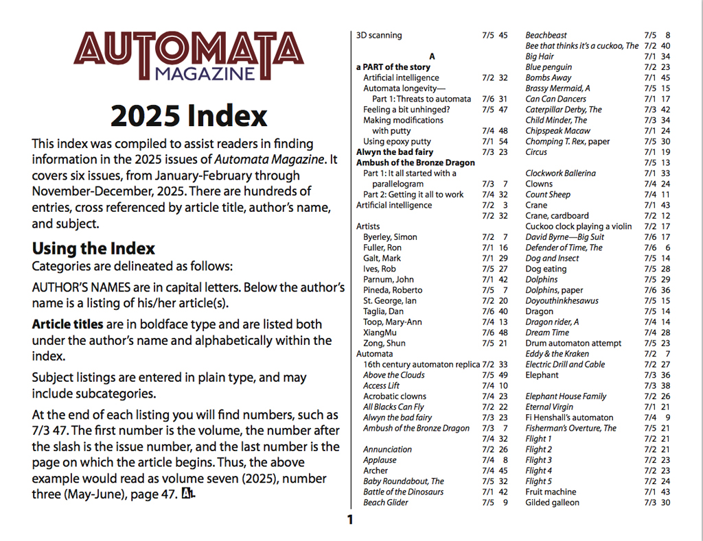 On this page you will find a yearly index to Automata Magazine. We will be posting an additional index for each year of the magazine as that year comes to a close.